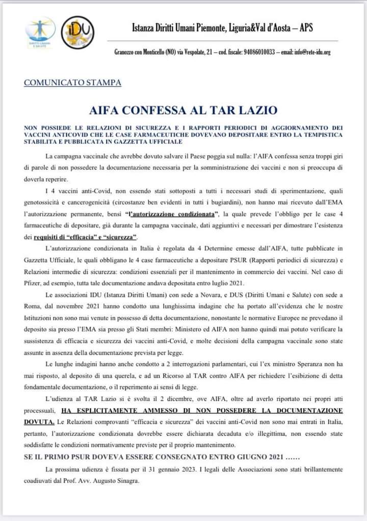 All’udienza del 2 dicembre 2022 presso il TAR Lazio, l’AIFA CONFESSA di non possedere le relazioni di sicurezza e i rapporti periodici di aggiornamento dei vaccini anti covid.
