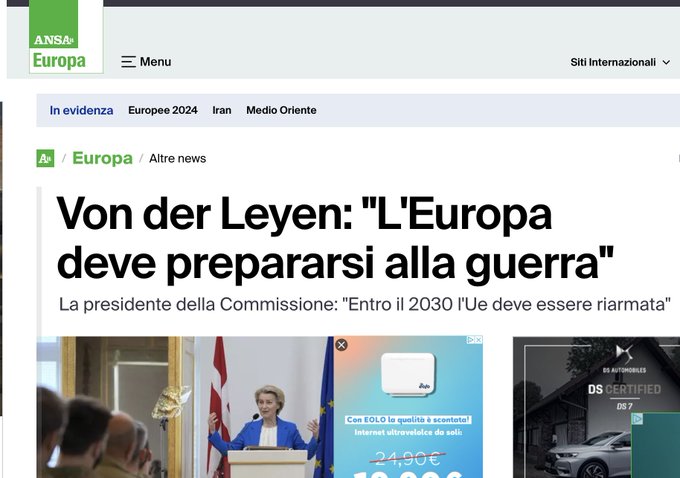 La #VonDerLeyen in pratica dice ai russi: “siamo certi che voi ci volete invadere, ma per cortesia non fatelo prima del 2030 che ci dobbiamo riarmare”. Questa è la UE. Che ovviamente, con proclami del genere, crea ansia, danneggia l’economia e rischia di portarci davvero nei guai.