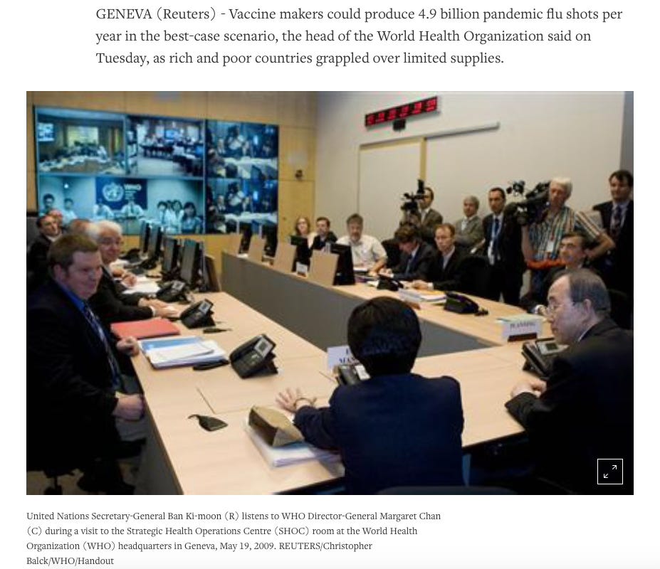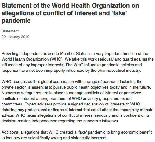 L'OMS era e rimane controllata dalle grandi aziende farmaceutiche. Nel 2009, la direttrice generale dell'OMS Margaret Chan ordinò all'industria farmaceutica 4,9 miliardi di dosi di vaccino contro l'H1N1. Si trattò di una truffa multimiliardaria.
