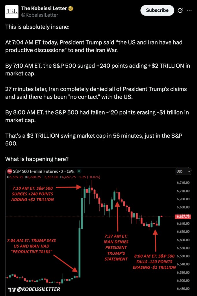 Kobeissi Letter (TKL) è una testata giornalistica piuttosto credibile che offre analisi tecniche e finanziarie su S&P 500, petrolio greggio, gas naturale, oro, obbligazioni e opzioni. TKL riporta su "X" che, entro dieci minuti da quando Trump ha affermato che Stati Uniti e Iran avevano avuto colloqui produttivi su come porre fine alla guerra (intorno alle 7 del mattino del 22 marzo), l'indice S&P 500 è balzato di 240 punti, aggiungendo letteralmente 2 trilioni di dollari al mercato. Circa 27 minuti dopo, l'Iran ha smentito categoricamente tutte le affermazioni di Trump, dichiarando che non c'è stato alcun contatto tra Iran e Stati Uniti.