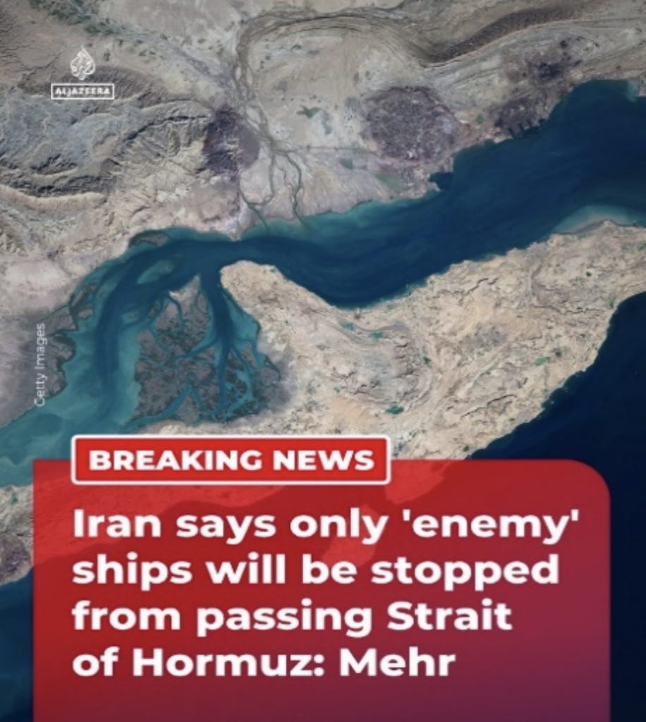 Questa volta la minaccia non si riferisce all'"arsenale nucleare" dell'Iran, bensì alla sua decisione di chiudere lo Stretto di Hormuz, controllato dall'Iran, a tutte le navi nemiche, ma non a quelle delle nazioni amiche.